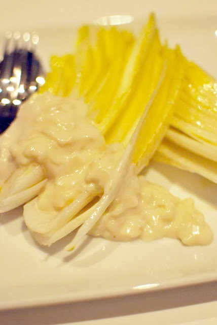 It turns out to be a very salty aioli with visible cubes of apples which you can't taste. The generous sprinkle of sea salt doesn't help the saltiness either. At least the witlof is bitter as it should be so the saltiness was a little bit bearable.