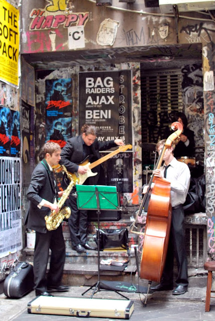 Dining in Melbourne laneways means there are more graffitis and in Centre Place there are the occasional musicians performing as well :)